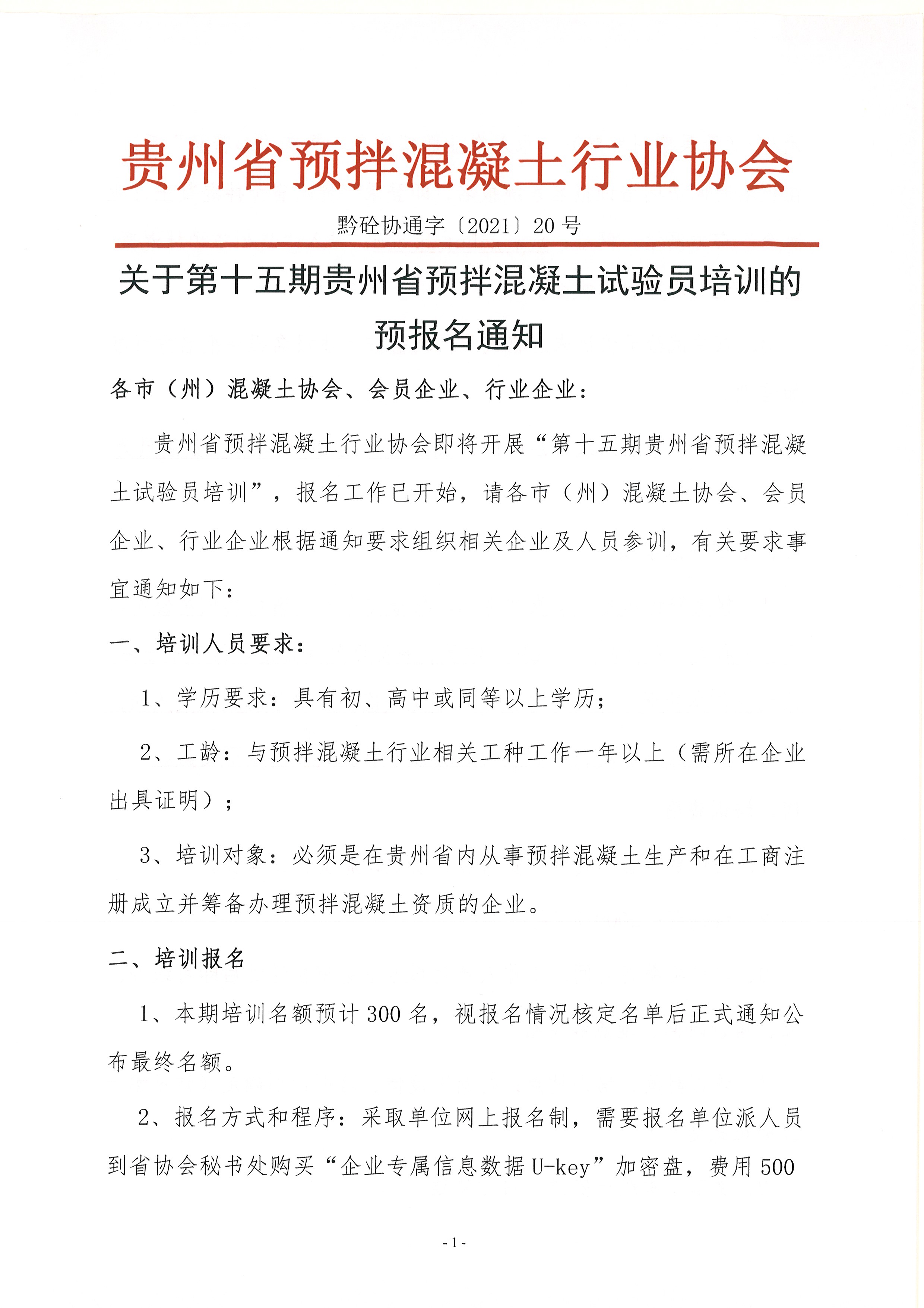黔砼协通字〔2021〕20号 关于第十五期预拌混凝土试验员培训的预报名通知