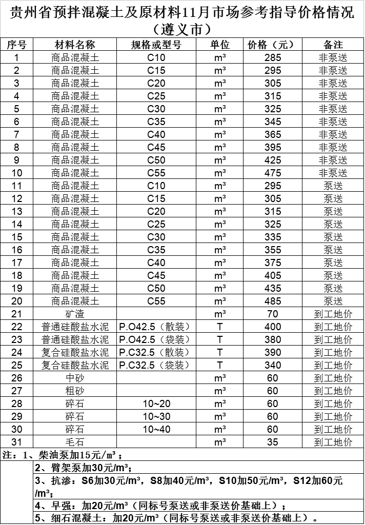 贵州省预拌混凝土及原材料11月市场参考指导价格情况