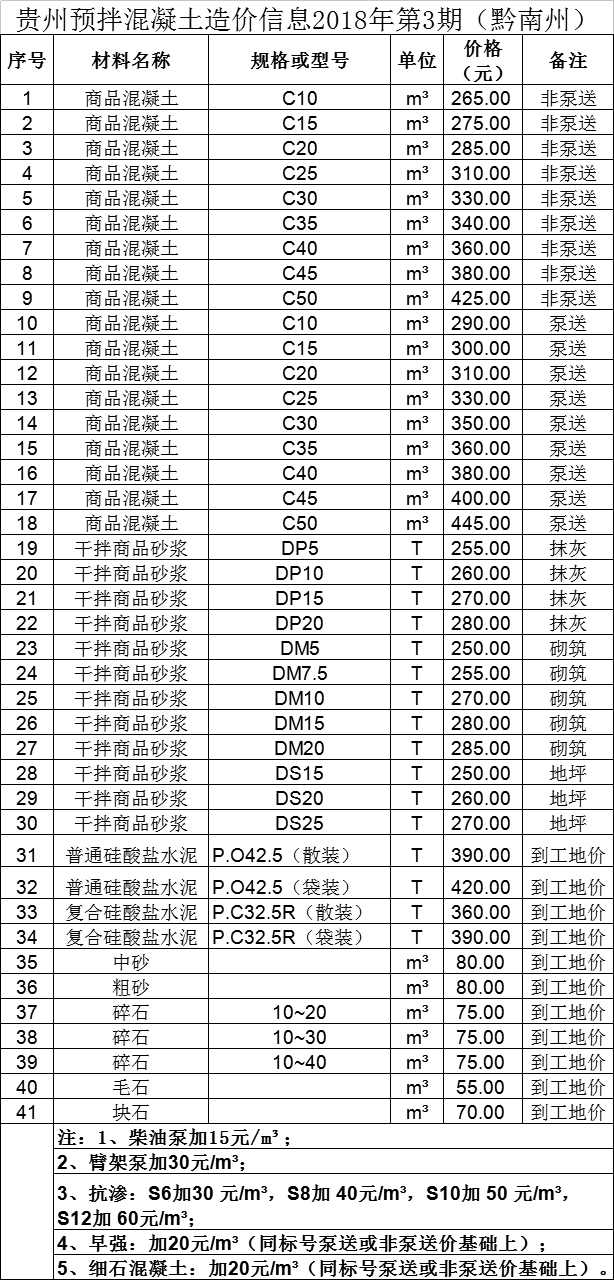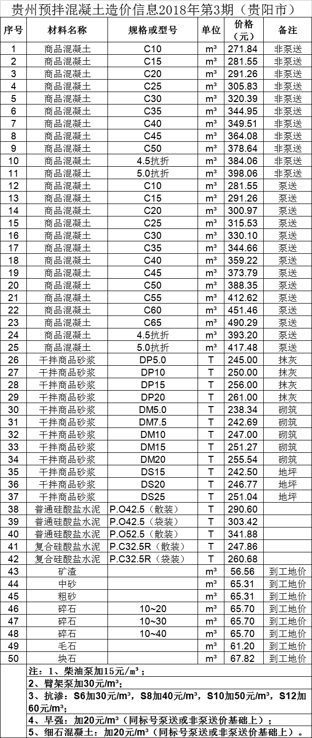 贵州预拌混凝土造价信息2018年第03期